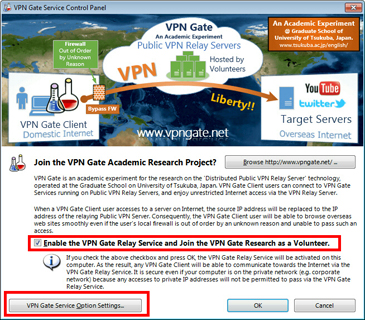 You must read the notices on the screen. Check the "Enable the VPN Gate Relay Service and join the VPN Gate Research as a Volunteer." check-box and click the "OK" button only if you understand and agree the notice.